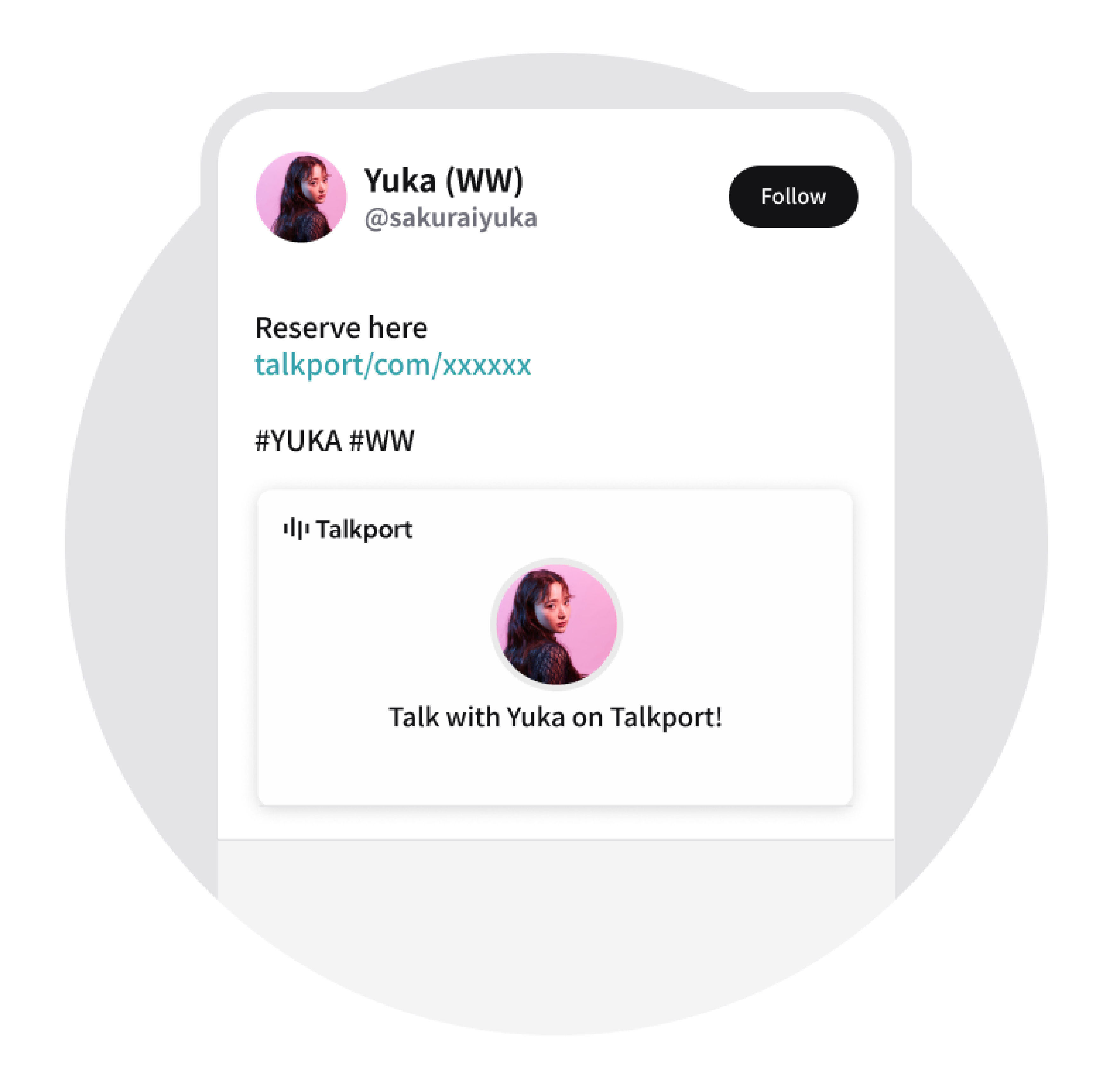 Talkportは憧れの人と1対1でオンライン会話ができるサービスです。XやInstagram等のSNSで募集を見つけて会話を予約した後、専用のアプリを利用して会話を楽しむことができます。WEBで予約して、アプリで通話するため、ややこしく見えますが、会話までのステップはとてもシンプルでかんたんです。
